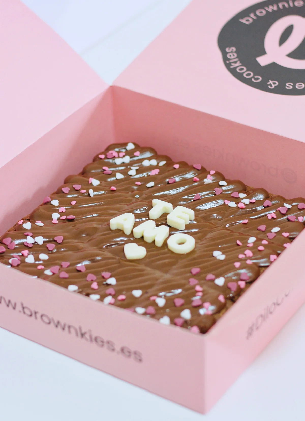 Brownie extra húmedo, cubierto con nutella , corazones comestibles y letras de chocolate con la palabra TE AMO. Ideal para los más románticos. Incluye tarjeta personalizable con tu mensaje para que sorprendas de verdad. Entrega a domicilio o recogida en tienda aliada (IL PIZZO, Calle Pérez Galdós 10, Santa Cruz de Tenerife). Tamaño 22cm.